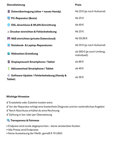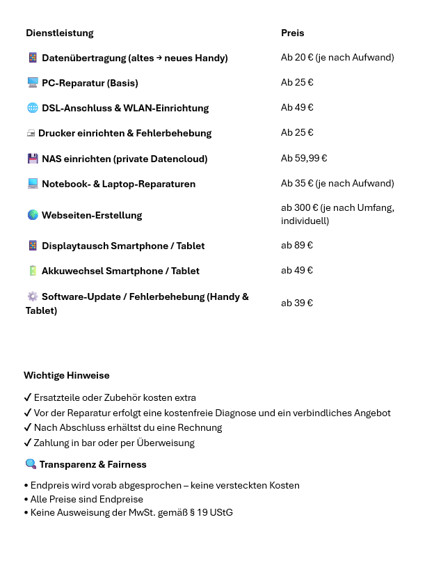 💶 Preisliste – IT- & Technik-Dienstleistungen